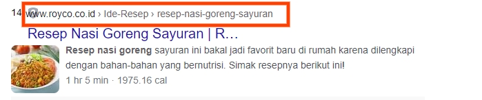 Kemudian alasan yang kedua adalah karena Google akan menampilkan breadcrumbs pada hasil SERP (Search Engine Result Page). Pada gambar di atas, dapat kita lihat bahwa Google menampilkan breadcrumbs di SERP untuk halaman website Royco dengan urutan Ide Resep> Resep nasi goreng sayuran.