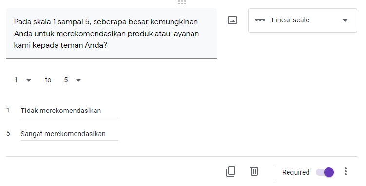 Isi pertanyaan Anda kemudian tentukan skala jawaban yang ingin dipergunakan. Pada contoh kali ini, kami menggunakan skala 1 sampai 5. Setelah itu isi label 1 dan label 5 dengan keterangan yang dapat memberikan informasi kepada pelanggan mengenai skala terendah (paling buruk) ke skala tertinggi (paling baik).
