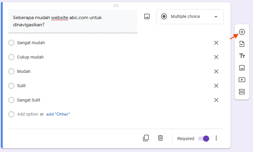 Jika Anda memiliki pertanyaan yang wajib diisi, silakan klik toggle icon Required yang ada pada bagian bawah pertanyaan. Dengan memilih tombol required menjadi aktif, maka pertanyaan yang diajukan akan memiliki tanda bintang berwarna merah. Artinya, pelanggan diwajibkan untuk mengisi jawaban pada pertanyaan tersebut. Jika pelanggan mengirim survey tanpa mengisi jawaban tersebut, Google Form akan mengirim pemberitahuan kepada pelanggan berbunyi “This is a required question” pada pertanyaan yang wajib mereka isi.