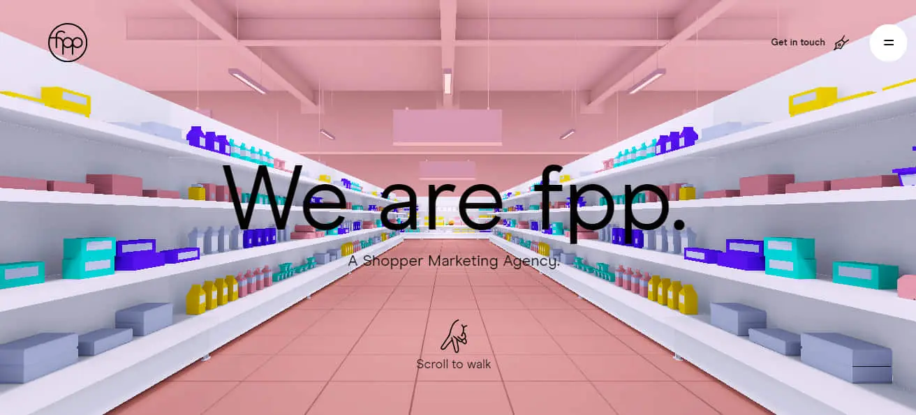 Contoh desain website yang kreatif juga bisa Anda temukan pada FPP Shopping yaitu agen pemasaran yang berfokus pada pembeli. Website ini menawarkan pengalaman yang sangat kreatif dan unik. Dengan menggunakan desain grafis 3D, animasi, dan desain warna-warni, website ini dapat menuntut interaktivitas yang tinggi dengan para pengguna. Anda dapat menavigasi website ini melalui menu hamburger fullscreen yang berubah bentuk. Desain kreatif ini menggunakan beberapa library tingkat lanjut seperti WebGL.