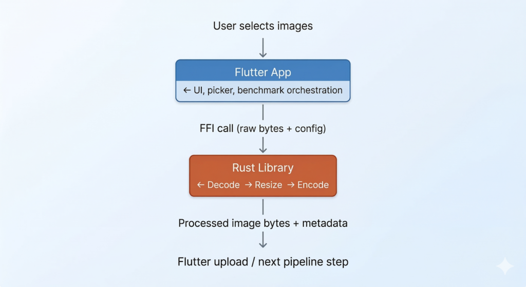 Di project benchmark ini, kami memang sengaja mengirim raw image bytes melewati boundary FFI, bersama config pemrosesan yang kecil. Rust memproses bytes tersebut, lalu mengembalikan result buffer dan metadata ke Dart.