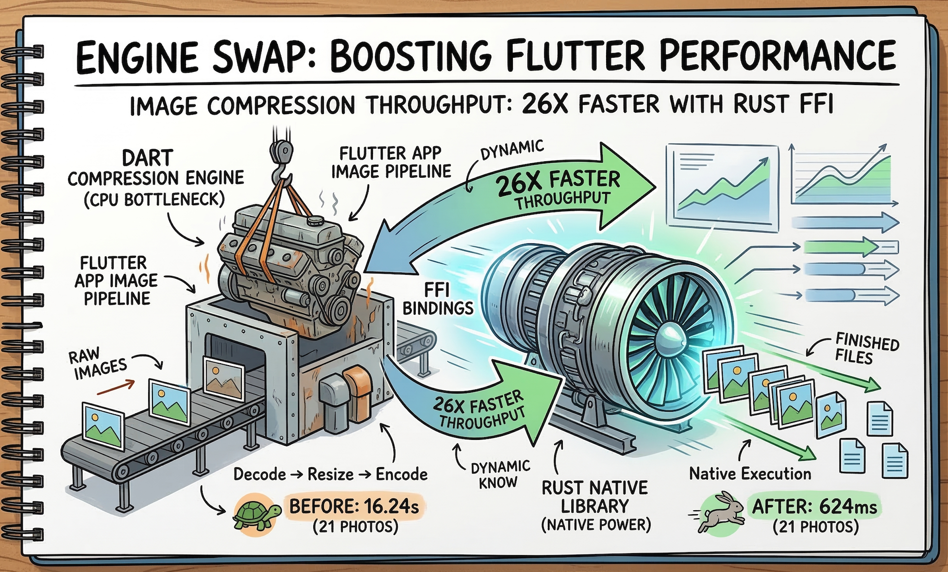 Di LOGIQUE, kami membangun aplikasi Flutter untuk klien yang butuh performa tinggi di lapangan. Artikel ini mendokumentasikan bagaimana tim kami menerapkan Flutter Rust FFI untuk image compression, dan berhasil mendapatkan speedup 26× dari baseline Dart. Repository: Source code benchmark lengkap tersedia di GitHub
