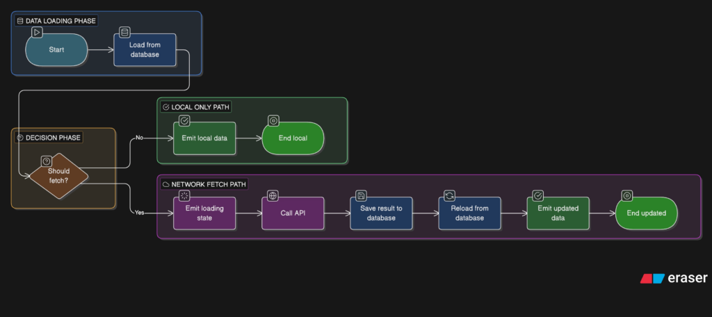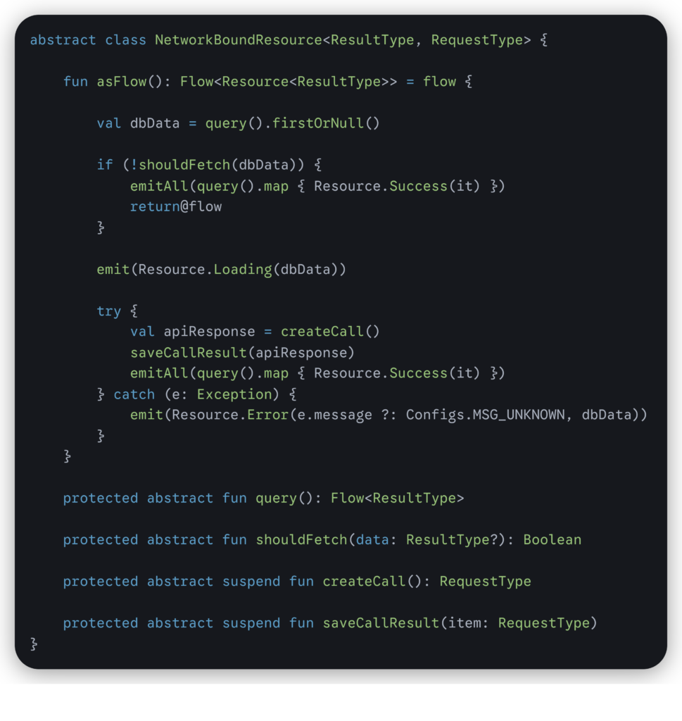 There are several approaches to ensuring that applications can function seamlessly in both modes. One of them is NetworkBoundResource, a class that allows us to define data synchronization strategies between local data sources and remote API data.