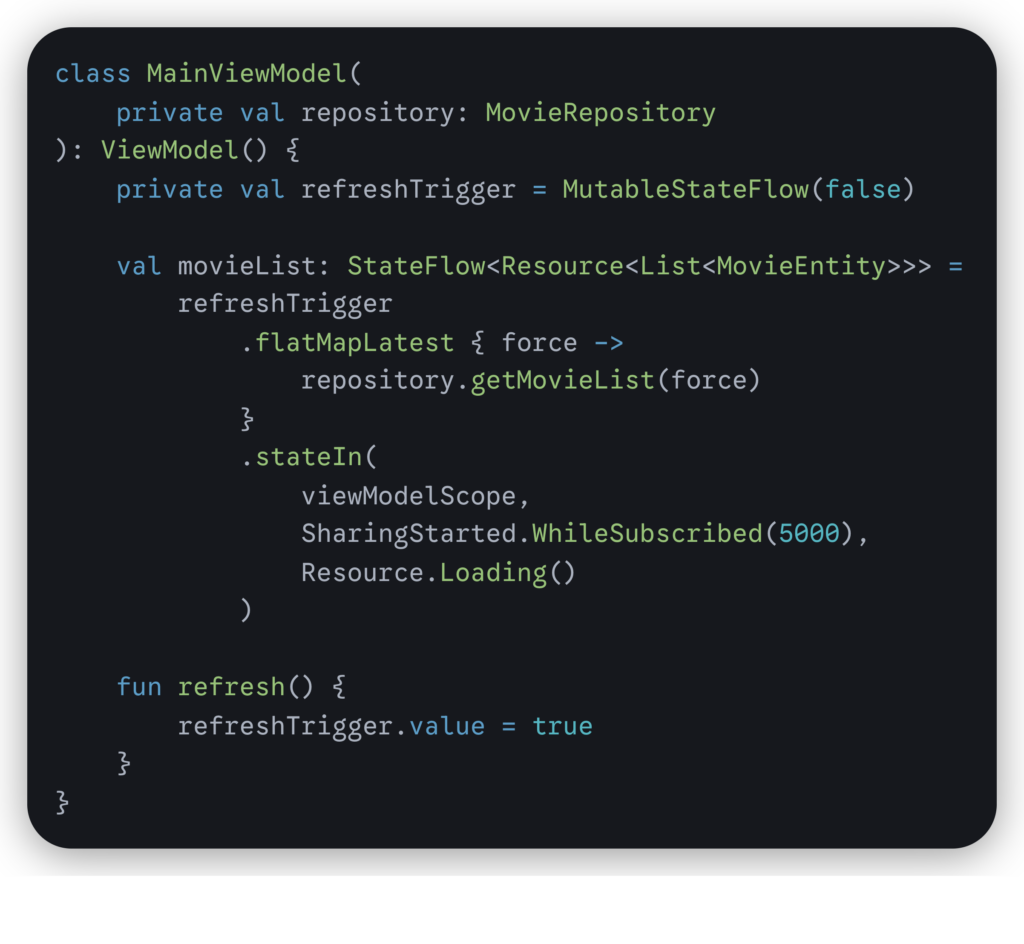 In the MainViewModel class, I initialize getMovieList() using flatMapLatest so that the old flow is automatically canceled, there are no stacked APIs, it is safe to refresh repeatedly, and it creates a refresh function with StateFlow.