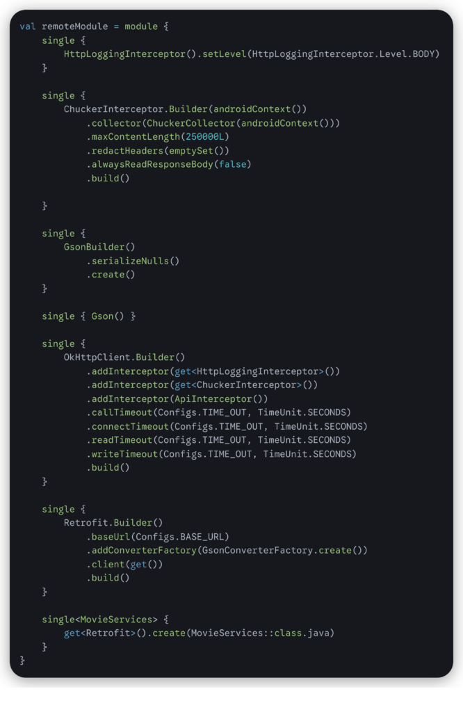 - Remote Module : For initializing Retrofit, OKHttp, Chunker, etc.